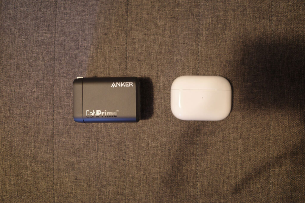 Ankerの何がいいって、急速な充電がこんな小さい存在で複数端末同時に行えるってこと。カバンの中で場所も取らず、重くもなく慎ましく「僕なんて…」みたいな感じでちょこんといるのが良い。小さいけど決して軽くはないんですね。AirPods Proと大きさは同じだけど、重さが全然違う。AirPods Proの重さは、70g。